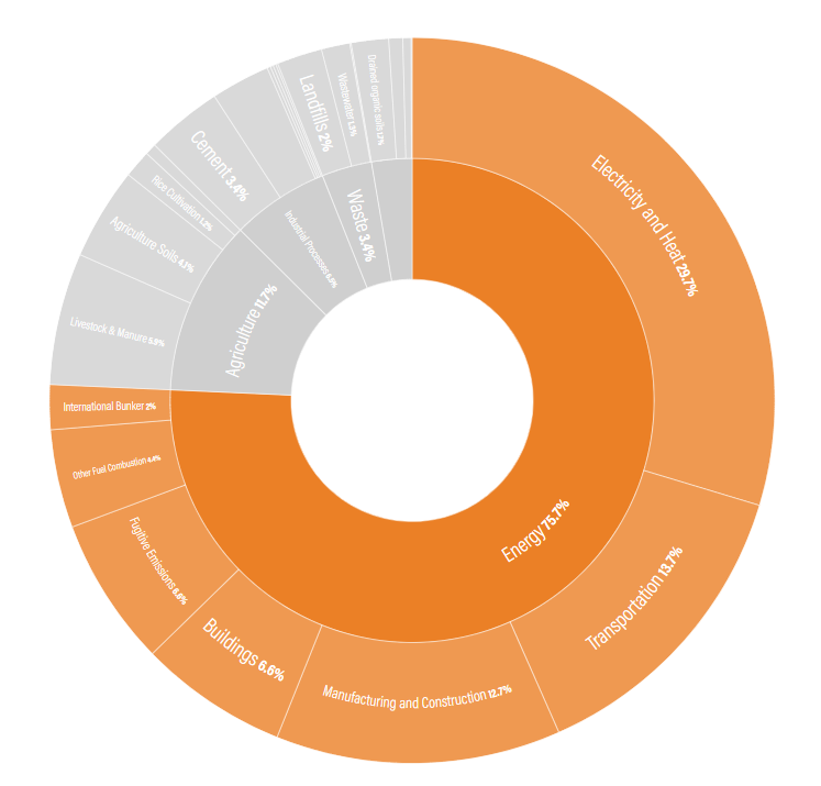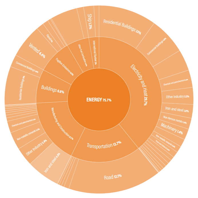 To understand the scale, here you can see a graph of Greenhouse Gas Emissions (GHG) by sector: